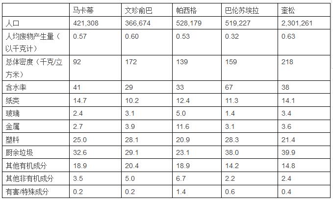 可以看出,在每座城市中,廚余垃圾以及其他的有機(jī)廢物都占到了廢物總產(chǎn)生量的大約50%??裳h(huán)利用的成分占到了42-49%,其中塑料占總量的21-28%。其他非有機(jī)成分和特殊成分則分別占到了2-6%和0.2-1.4%。