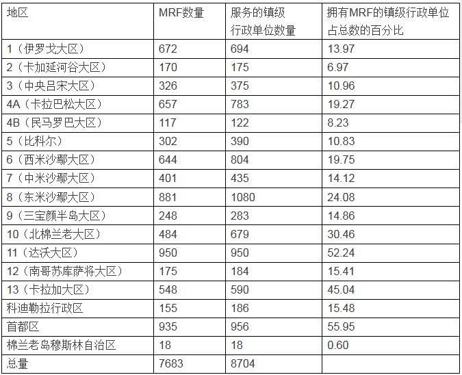 2012年時(shí),菲律賓全國有7683個(gè)回收利用設(shè)施,滿足了8704個(gè)鎮(zhèn)的需求。下表列出了菲律賓全國回收利用設(shè)施的狀況。