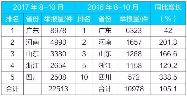 2017年8-10月,公眾使用微信舉報(bào)最頻繁的是廣東、河南兩省,舉報(bào)數(shù)量合計(jì)占全國(guó)總數(shù)的31.2%。