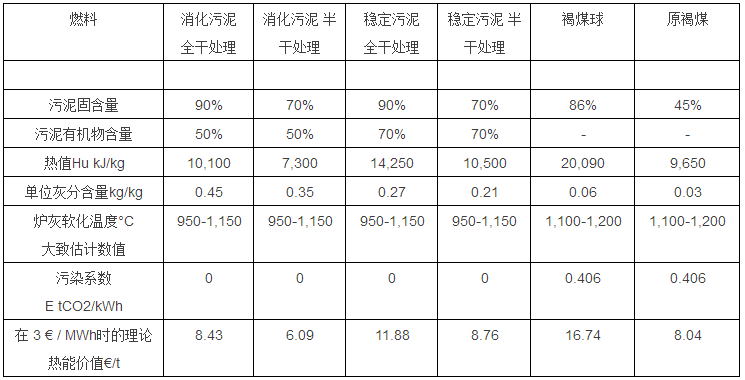 當消化污泥的有機物含量 OTR = 50% 和干化后污泥固含量為90% DS時,污泥熱值大約是Hu = 10,100 kJ/kg 或 2.81 kWh/kg。在以下表 1內,舉例列出了各種不同類型的消化污泥和好氧穩(wěn)定化污泥性能參數(shù),并和褐煤進行比較。根據(jù)污泥熱值,還計算了干化污泥的熱能商業(yè)價值。