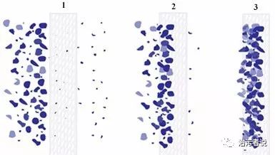 在板框式壓濾機(jī)運(yùn)行過(guò)程中,污泥泵把加過(guò)藥劑(調(diào)理劑、脫水劑)的污泥送到壓濾機(jī)內(nèi),將污泥泥漿在壓濾機(jī)內(nèi)均勻地分布。這部分污泥固體開(kāi)始在濾布上進(jìn)行堆積,并開(kāi)始初步的過(guò)濾。加藥后的污泥中大部分的泥水分離的是通過(guò)在板框之間濾布堆積過(guò)程中完成的。起初一些污泥的細(xì)小細(xì)??梢源┻^(guò)濾布(如圖1),但越來(lái)越多和越來(lái)越大的固體開(kāi)始在濾布過(guò)濾過(guò)程中被攔截下來(lái),攔截下來(lái)的上的的污泥層(如圖2)很像一個(gè)預(yù)涂層。該層捕集微粒并形成濾餅(如圖3)。