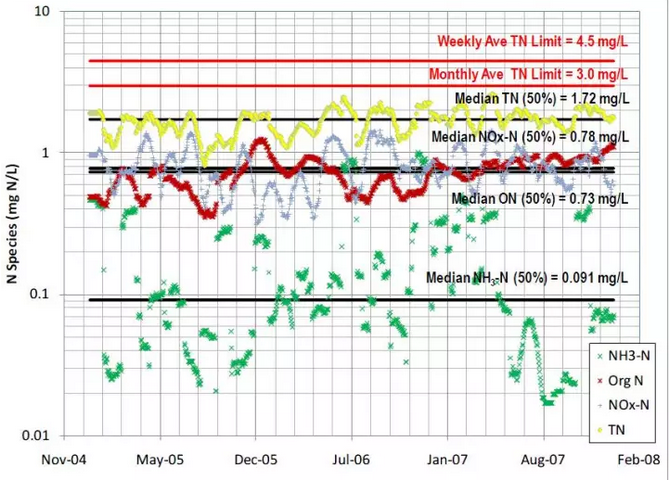 如果單獨(dú)對某個污水處理廠做一點(diǎn)深入的分析還會得到一些其他信息,WesternBranch污水處理廠的處理規(guī)模約12萬噸/日,出水TN月均值要求達(dá)到3mg/L,周均達(dá)到4.5mg/L,處理工藝采用三段式活性污泥法。