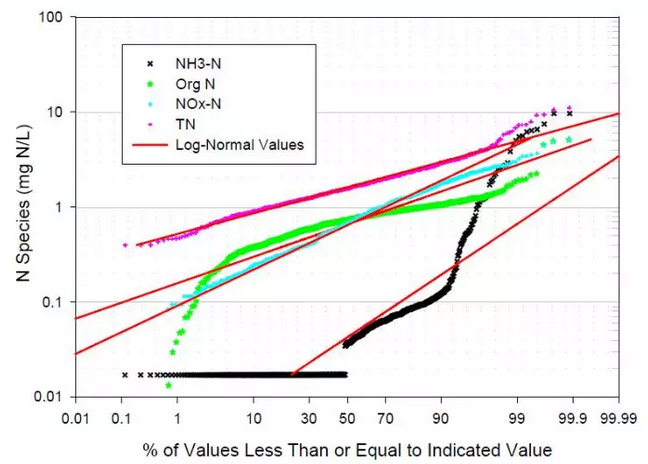 同時,在上述統(tǒng)計分析過程中,TPS-14d與TPS-50%、TPS-95%的比值也是一個有趣的現(xiàn)象,對于TN和TP,TPS-14d約為TPS-50%的40~60%,TPS-95%約為TPS-50%的200~300%,這充分說明即使在美國最好的脫氮除磷污水處理廠(相當(dāng)一部分是達(dá)到極限脫氮除磷標(biāo)準(zhǔn))其出水氮磷水質(zhì)也存在較大的波動性。