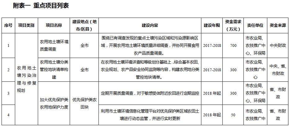 農(nóng)用地土壤分區(qū)分類管控與治理修復(fù)重點項目共10項,需專項資金總計41850萬元;在產(chǎn)企業(yè)用地土壤環(huán)境風(fēng)險管控重點項目共5項,預(yù)計專項資金總計47800萬元;關(guān)閉搬遷企業(yè)地塊土壤治理與修復(fù)項目共3項,預(yù)計專項資金總計14200萬元;垃圾填埋場及周邊環(huán)境整治重點項目共5項,預(yù)計專項資金總計14709萬元;土壤修復(fù)整治重點項目共15項,預(yù)計專項資金總計54600萬元;工業(yè)園區(qū)風(fēng)險防范共2項,預(yù)計專項資金總計8300萬元;土壤污染防治能力提升重點項目共3項,預(yù)計專項資金總計6700萬元。