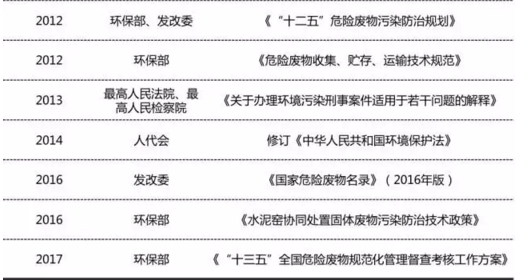 危廢政策不斷出臺,尤其是省級細則落地:1)2017年環(huán)保部出臺“十三五”全國危險廢物規(guī)范化管理督查考核工作方案,各省近期均推出省級危廢規(guī)范化管理督查方案;2)《國家危險廢物名錄》自2016年8月1日起施行;新修訂的《固體廢物污染環(huán)境防治法》取消危險廢物省內(nèi)轉(zhuǎn)移審批手續(xù);3)2016年最高司法機關(guān)就環(huán)境污染犯罪出臺專門司法解釋;4)2018年起實施《環(huán)境保護稅法》,危廢稅額1000元/噸;5)環(huán)保部發(fā)布《水泥窯協(xié)同處置固體廢物污染防治技術(shù)政策》,支持水泥窯協(xié)同處置。
