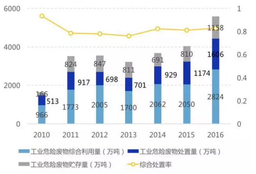 在環(huán)保監(jiān)管力度增強,各省均推出省級督查方案背景下,危廢處置剛需再次提升,尤其是要求進入規(guī)范渠道處置的量增加。但市場情況是,實際產(chǎn)生量遠大于統(tǒng)計量(披露16年5347萬噸,預(yù)計實際8000萬噸),低綜合利用處置率(83%),低有效利用率(25%),導(dǎo)致整體危廢的處置供不應(yīng)求。