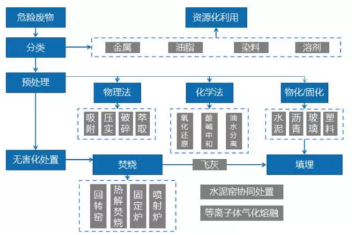 危廢基本處理步驟包括分類、預(yù)處理、最終處置。金屬、油脂、溶劑、染料等由回收利用價值的廢物可被資源化利用;預(yù)處理包括物理法、化學(xué)法,預(yù)處理后的危廢才能進入焚燒或填埋等最終處置設(shè)施中。