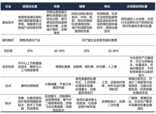我國危廢處理方式基本以無害化處理及資源化利用為主。資源化利用的模式為危廢資源化企業(yè)向上游產(chǎn)廢企業(yè)收取有利用價值的廢物,再提純生產(chǎn)為資源化產(chǎn)品,收入來自于銷售產(chǎn)品,盈利受上游廢物價格及下游金屬價格影響。無害化處置是處置企業(yè)向產(chǎn)廢企業(yè)收取費用,主要包括焚燒、填埋、物化,水泥窯協(xié)同處置也可列為無害化處置的方法。無害化毛利較高,焚燒毛利可達40%以上,填埋毛利50%以上。水泥窯協(xié)同處置與水泥生產(chǎn)共攤成本,邊際成本較低。