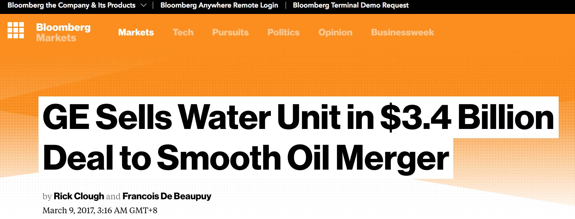 水行業(yè)巨頭法國蘇伊士環(huán)境聯(lián)合加拿大第二大養(yǎng)老金投資管理機構(gòu)—魁北克儲蓄投資集團(Caisse de dép?t et placement du Québec )正式確認收購GE水處理。GE水處理是在2016年10月宣布出售的,之后曾出現(xiàn)過諸如威立雅、全球最大儀器公司丹納赫集團(Danaher Corporation)、著名的私人股權(quán)投資和投資管理公司黑石集團(Blackstone Group)等潛在買家的傳聞。 在上個月底,蘇伊士環(huán)境的新聞發(fā)言人也對外宣布正在考慮收購GE工業(yè)水處理業(yè)務(wù)的可能性。是什么讓蘇伊士在官宣之后的半個月內(nèi)就完成這宗收購呢?今天我們將帶大家看看全球各大媒體對這次收購的解讀。