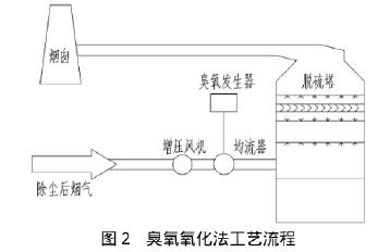 臭氧氧化法作為一種氧化脫氮方法,通常在脫硫塔前端的一段煙道注入臭氧,在均流器的作用下,使燒結(jié)煙氣中的NOx與臭氧充分接觸,并將NOx氧化成最高價態(tài),在后置的脫硫裝置內(nèi)與堿液發(fā)生反應(yīng),最終生成硝酸鹽,從而脫出煙氣中的NOx。工藝流程如圖2所示。其化學(xué)反應(yīng)式如下:O3+NO=NO2+O2;O2+2NO2=2NO3;NO2+NO3=N2O5;N2O5+H2O=2HNO3。
