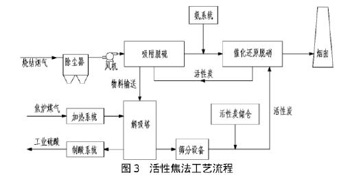 一體化脫硫脫硝技術(shù)已逐漸成為煙氣凈化工藝的一個重要選擇。目前研究較為廣泛并具有實用價值的聯(lián)合脫硫脫硝技術(shù)主要有活性焦法、SNRB、電子束法等。在燒結(jié)煙氣凈化上獲得較為廣泛認(rèn)可的只有活性焦法,其工藝流程如圖3所示。