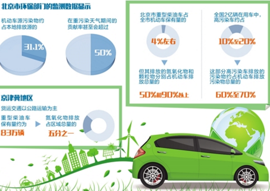 北京市環(huán)保部門的監(jiān)測數(shù)據(jù)顯示,機(jī)動(dòng)車源污染物約占本地排放源的31.1%,在重污染天氣期間甚至?xí)^50%。
