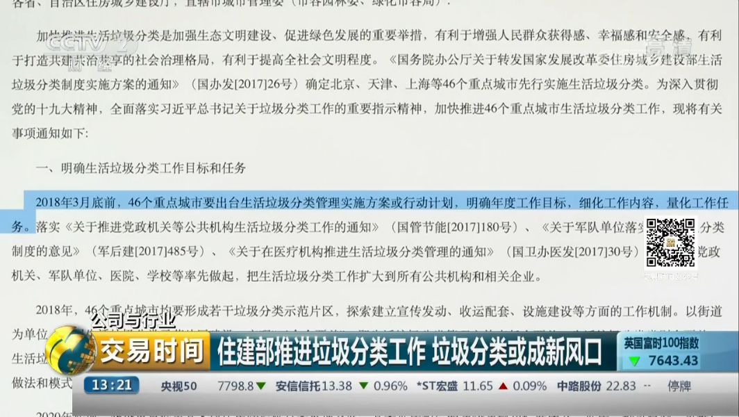 隨著2017年成為環(huán)保政策爆發(fā)年之后,環(huán)保板塊活躍度一度攀升,其中2017年7月18日至10月13日,節(jié)能環(huán)保指數(shù)上漲17.09%,跑贏同期上證綜指10.35個百分點。2017年底,住建部發(fā)文要求加快推進46個重點城市的垃圾分類工作。那么垃圾的分類回收、處理會給企業(yè)帶來哪些新的商機呢?