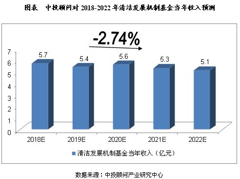 2016年,清潔發(fā)展機制基金當年收入為6.27億元,同比減少0.56億元。我們預(yù)計,2018年清潔發(fā)展機制基金當年收入將達到5.7億元,未來五年(2018-2022)年均復(fù)合增長率約為-2.74%,2022年清潔發(fā)展機制基金當年收入將達到5.1億元。