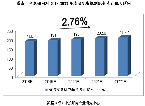 2016年,清潔發(fā)展機制基金累計收入為174.04億元,同比增長3.74%。我們預(yù)計,2018年清潔發(fā)展機制基金累計收入將達到185.7億元,未來五年(2018-2022)年均復(fù)合增長率約為2.76%,2022年清潔發(fā)展機制基金累計收入將達到207.1億元。