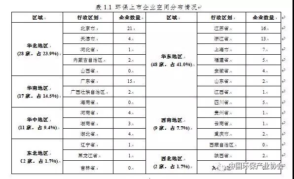 從環(huán)保上市企業(yè)的地理分布看,大部分環(huán)保上市企業(yè)集中在北京市及華東、華南地區(qū),特別是東南沿海省份(如廣東省、浙江省、江蘇省等),而東北、西北地區(qū)部分省市的環(huán)保上市企業(yè)分布較少。這與中國各省的經(jīng)濟發(fā)展狀況、城鎮(zhèn)化水平、人口密度等的分布情況較為一致。北京市以及東南沿海省份憑借其地緣優(yōu)勢、較為充沛的資本量、人才薈萃等有利因素,形成了可觀的行業(yè)市場,集聚了大部分環(huán)保上市企業(yè);東北地區(qū)作為經(jīng)濟嚴重下滑的老工業(yè)區(qū),西北地區(qū)經(jīng)濟欠發(fā)達、人口密度稀薄,大型環(huán)保上市企業(yè)分布稀少,但隨著“一帶一路”建設的深入推進,未來西北地區(qū)環(huán)保產(chǎn)業(yè)或?qū)⒌玫介L足發(fā)展(見表1.1)。