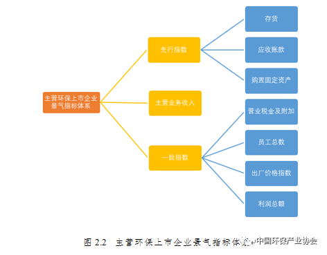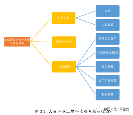 主營環(huán)保上市企業(yè)景氣指數(shù)的一致合成指數(shù)集合包括:營業(yè)稅金及附加、員工總數(shù)、出廠價格指數(shù)、利潤指數(shù)四項指標;先行合成指數(shù)集合包括:存貨、應收賬款、購置固定資產(chǎn)三項指標。主營環(huán)保上市企業(yè)景氣指標體系如圖2.2所示。