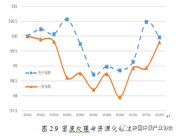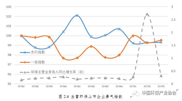 一致指數(shù)顯示,相較景氣波動下滑的2016年,2017年A股環(huán)保上市企業(yè)景氣表現(xiàn)呈現(xiàn)持續(xù)上升態(tài)勢,3季度一致指數(shù)數(shù)值為99.05,高于2016年同期的98.29。主營環(huán)保上市企業(yè)2017年總體景氣表現(xiàn)優(yōu)于2016年,且呈現(xiàn)上升態(tài)勢,3季度數(shù)值一致指數(shù)數(shù)值達99.53,較上年同期上升了1.79,且略高于同期A股環(huán)保上市企業(yè)(見圖2.3、圖2.4)。