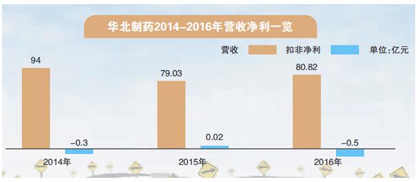 華北制藥近幾年業(yè)績情況一直不太樂觀,北京商報記者翻閱公司財報發(fā)現(xiàn),2014-2015年,華北制藥營收均呈下降趨勢,較上年分別同比下降24.42%、15.87%,實現(xiàn)扣非凈利分別為-3054萬元、240萬元;2016年,公司營收有2.28%的增幅,扣非凈利為-5123萬元。