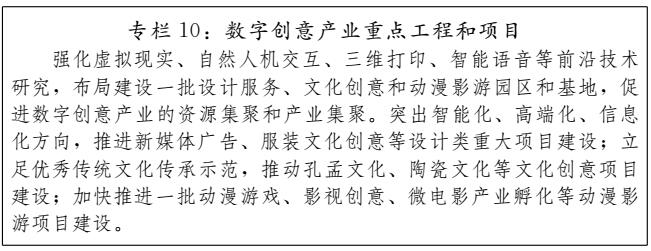 ?。ㄆ撸?shù)字創(chuàng)意產業(yè)。以文化創(chuàng)意、設計服務為核心,引導支持數(shù)字創(chuàng)意產業(yè)領域的產品、服務、技術、模式、業(yè)態(tài)創(chuàng)新,實現(xiàn)與相關產業(yè)融合發(fā)展,著力構建文化引領、技術先進、要素齊備、鏈條完整、結構合理、效益良好的數(shù)字創(chuàng)意產業(yè)發(fā)展格局。“十三五”期間,數(shù)字創(chuàng)意產業(yè)產值年均增長25%以上,占GDP比重逐年提高。