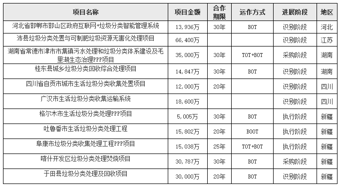 垃圾分類PPP項目表