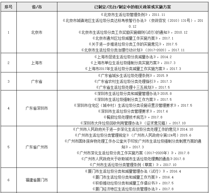 附:地方生活垃圾分類政策一覽
