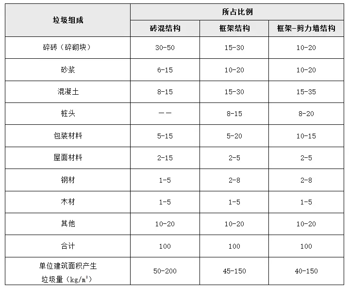 舊建筑物拆除垃圾的組成與建筑物的種類有關:廢棄的舊民居建筑中,磚塊、瓦礫、混凝土塊、渣土約占80%,其余為木料、碎玻璃、石灰、金屬、包裝物、防水材料、各類電信線和電源線、塑料制品等;廢棄的舊工業(yè)、樓宇建筑中,混凝土塊約占50%~60%,其余為金屬、磚塊、砌塊、塑料制品等。對不同結構形式的建筑工地,垃圾組成比例略有不同,而垃圾數(shù)量因施工管理情況不同在各工地差異很大。