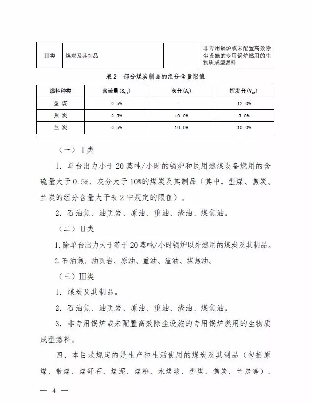 第Ⅰ類,考慮到中西部地區(qū)部分城市煤炭使用還存在規(guī)模化水平不高的現(xiàn)象,從鼓勵煤炭清潔利用角度,提出單臺出力小于20蒸噸/小時的鍋爐和民用燃煤設備燃用的含硫量大于0.5%、灰分大于10%的煤炭納入禁燃范圍。其中,型煤、焦炭、蘭炭的揮發(fā)分含量不能大于12%、5%和10%,對型煤的灰分含量沒有要求。