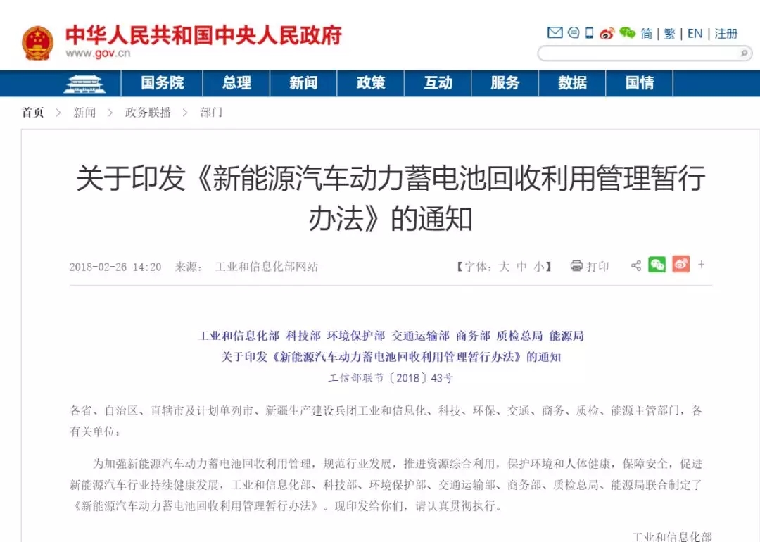 2月26日,工業(yè)和信息化部、科技部、環(huán)境保護部、交通運輸部、商務部、質(zhì)檢總局、能源局印發(fā)《新能源汽車動力蓄電池回收利用管理暫行辦法》的通知,旨在加強新能源汽車動力蓄電池回收利用管理,規(guī)范行業(yè)發(fā)展。