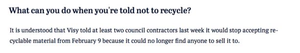 Visy稱中國(guó)的禁令是此舉的理由。面對(duì)媒體,Visy 拒絕采訪,Wheelie Waste 也沒(méi)有對(duì)此事件做任何評(píng)論。
