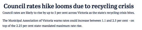 據(jù)《The Age》報(bào)道,維州垃圾回收危機(jī)將造成市政費(fèi)上漲高達(dá)5%。市政費(fèi)是市政廳對(duì)管轄區(qū)內(nèi)所有業(yè)主(包括居民和企業(yè))征收的費(fèi)用,其中有一部分會(huì)用于當(dāng)?shù)氐睦幚怼?/p>