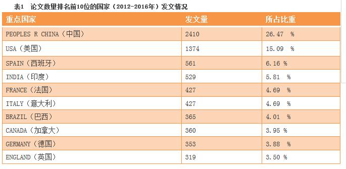 根據(jù)WOS檢索結果,全世界共有144國家或地區(qū)發(fā)表了土壤污染防治領域相關文獻。其中論文數(shù)量排名在前TOP10的國家(詳見表1)共發(fā)表了5760篇文獻,占總量的63.25%。我國在論文數(shù)量上占有絕對的優(yōu)勢,2012年—2016年共發(fā)表論文2410篇,位居榜首。