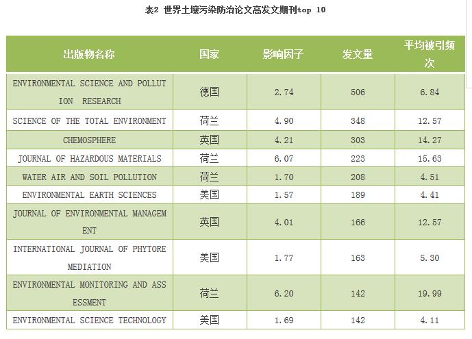 根據(jù)檢索結果,全球共有736種期刊發(fā)表了土壤污染防治領域的相關論文,該領域內發(fā)文量居前10位的期刊如下(表2)。這10種期刊的總發(fā)文量為1157篇,占總量比例為26.25%,平均影響因子3.485。其中,荷蘭占據(jù)4席,美國占據(jù)3席,英國占據(jù)2席,德國占據(jù)1席。并且,影響因子前三名也均屬荷蘭。發(fā)文最多的期刊是德國的《ENVIRONMENTALSCIENCEANDPOLLUTIONRESEARCH》,影響因子最高的期刊是荷蘭的《ENVIRONMENTALMONITORINGANDASSESSMENT》。由此可見,在土壤污染防治相關領域中,荷蘭期刊已達較高的學術水平。