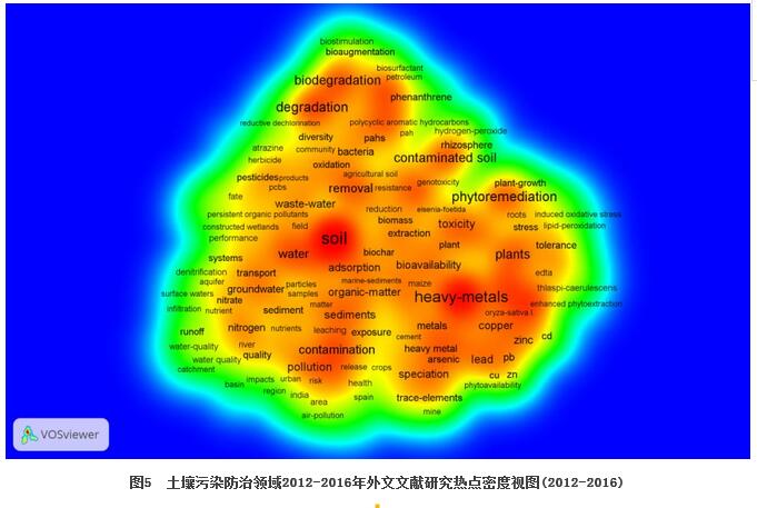 將webofscience上檢索到的9323條英文數(shù)據(jù)導入VOSviewer,共分析了491個關鍵詞,得出的高頻關鍵詞見表3。據(jù)統(tǒng)計,soil(土壤),heavy-metals(重金屬),出現(xiàn)頻次最高,可見重金屬的污染防治一直是領域的關注重點。degradation(退化)排名第四,反映出近5年來土壤退化問題備受關注。此外,植物修復和微生物修復也是近來的研究熱點。