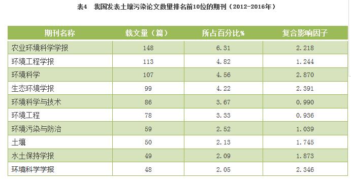據(jù)統(tǒng)計,國內發(fā)表土壤污染防治論文數(shù)量排名前10位的期刊如表4所示?!掇r業(yè)環(huán)境科學學報》載文量最高,共148篇,占總發(fā)文量的6.31%;而《環(huán)境工程學報》以113篇的載文量,位居第二,其論文數(shù)量占總發(fā)文量的4.82%;《環(huán)境科學》以第二名6篇之差位列第三,共107篇,占總發(fā)文量的4.56%。