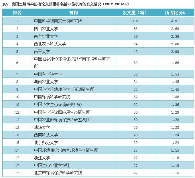 截至2016年發(fā)表的土壤污染防治相關研究論文中,發(fā)文量位居前20位的科研機構或單位見表5。中國科學院南京土壤研究所發(fā)文量101篇,以絕對性優(yōu)勢居榜首,四川農業(yè)大學以63篇發(fā)文居第二,南京農業(yè)大學以7篇之差位列第三。前20位的機構中,共有10所高校入圍,其中4所是農業(yè)類院校;科研機構有9個入圍??梢?,高校和科研機構是我國研究土壤污染防治的主力軍。