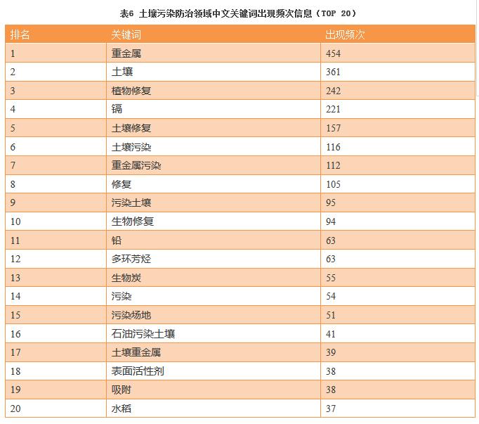 將中國知網(wǎng)收錄的近5年土壤污染防治核心期刊文獻2345篇導入VOSiewer,分析后得出的高頻關鍵詞見下表。由表6可見,出現(xiàn)頻次最高的是重金屬,出現(xiàn)了454次,遠遠高于其他關鍵詞,出現(xiàn)頻次排名第二和第三分別是土壤和植物修復。由此可見,我國在土壤污染防治研究領域,關注最多的是重金屬污染的植物修復與生物修復技術研究,與之前分析的國際研究熱點吻合。
