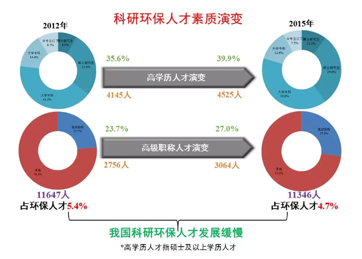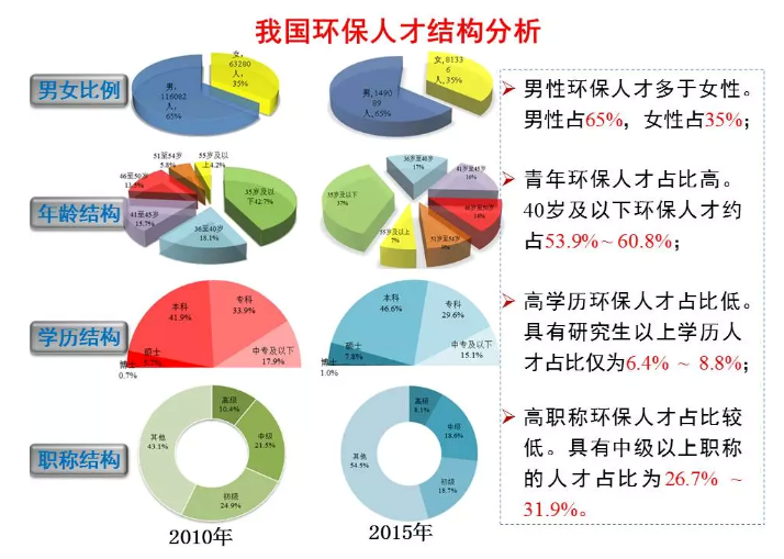 數(shù)據(jù)顯示,2010年我國環(huán)保系統(tǒng)(全國各級環(huán)保機(jī)關(guān)和直屬單位的從業(yè)人員)人才總量為17.9萬人,其中環(huán)境監(jiān)測人才為33730人,環(huán)境執(zhí)法人才為60652人。到2015年,我國環(huán)保人才總量增長為24.2萬人,比2010年增長6.3萬人,增長35%。其中環(huán)境監(jiān)測人才為70621人,比2010年增長109.4%,環(huán)境執(zhí)法人才為79322人,比2010年增長30.8%。