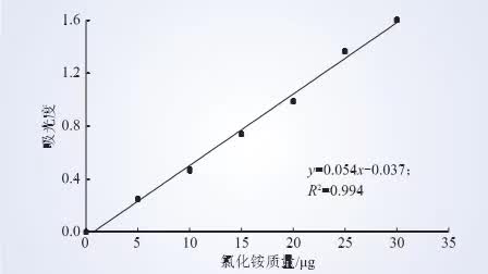 氯化銨標(biāo)準(zhǔn)液吸光度標(biāo)準(zhǔn)曲線如圖2所示。圖2標(biāo)準(zhǔn)液氯化銨含量對(duì)應(yīng)吸光度存在以下關(guān)系: