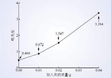盡管網(wǎng)格布點(diǎn)取樣分析法能較為全面地反映電廠氨逃逸狀況,但實(shí)際取樣過程中若操作不當(dāng)會(huì)使少量粉塵顆?;烊霕右褐校淇赡軙?huì)對(duì)測(cè)試結(jié)果產(chǎn)生影響。為判斷灰分的摻入對(duì)靛酚藍(lán)分光光度法測(cè)試結(jié)果的影響,分別在標(biāo)準(zhǔn)氯化銨樣品(濃度為1μg/mL,體積為10mL)中添加0.01、0.02、0.04g的飛灰,以模擬粉塵進(jìn)入測(cè)試樣品中的狀況。將加入粉煤灰后的各樣品搖勻,震蕩后靜止10min取上清液進(jìn)行分光光度分析,結(jié)果如圖3所示。