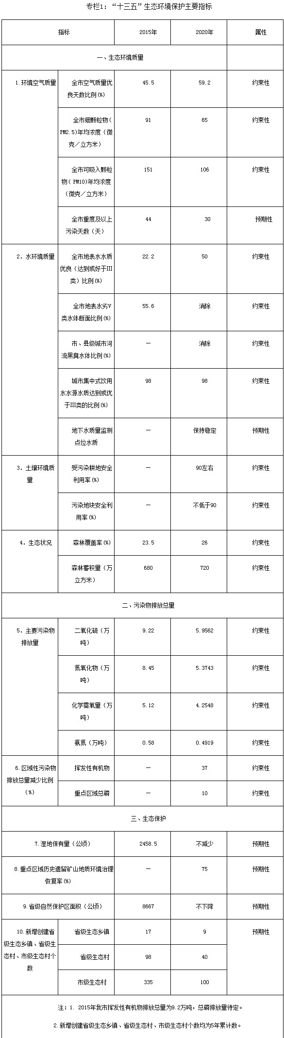 2020年,我市化學(xué)需氧量、氨氮、二氧化硫、氮氧化物排放總量分別控制在4.2548萬(wàn)噸、0.4919萬(wàn)噸、5.9562萬(wàn)噸、5.3743萬(wàn)噸以內(nèi),比2015年分別下降16.9%、15.2%、35.4%、36.4%,揮發(fā)性有機(jī)物和總磷排放總量比2015年下降37%和10%。