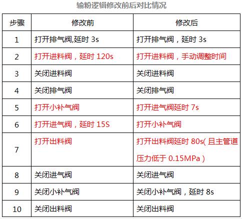 3、經(jīng)過(guò)對(duì)輸粉邏輯進(jìn)行研究,發(fā)現(xiàn)不能“順啟”的主要原因是,輸粉邏輯中氣動(dòng)門(mén)打開(kāi)先后順序不合理,氣動(dòng)門(mén)開(kāi)、關(guān)時(shí)間和邏輯設(shè)置存在問(wèn)題。出料閥經(jīng)常犯卡打不開(kāi),主要是原來(lái)的邏輯設(shè)置(“打開(kāi)進(jìn)氣閥,開(kāi)到位延時(shí)15s”→“打開(kāi)出料閥”),由于設(shè)置中“打開(kāi)進(jìn)氣閥”的時(shí)間較長(zhǎng),造成發(fā)送罐內(nèi)氣化時(shí)間較長(zhǎng),發(fā)送罐內(nèi)壓力過(guò)高,這樣發(fā)送罐出料閥頂著壓力開(kāi)閥,因此經(jīng)常犯卡,開(kāi)不動(dòng);在當(dāng)時(shí)的運(yùn)行調(diào)整中由于出料閥犯卡開(kāi)不動(dòng),試想通過(guò)打開(kāi)進(jìn)料閥或排氣閥釋放發(fā)送罐內(nèi)的壓力,結(jié)果由于發(fā)送罐內(nèi)壓力過(guò)高,導(dǎo)致進(jìn)料閥和排氣閥也經(jīng)常犯卡,打不開(kāi),嚴(yán)重時(shí)就找檢修人員處理。