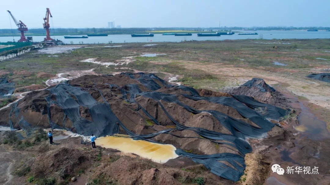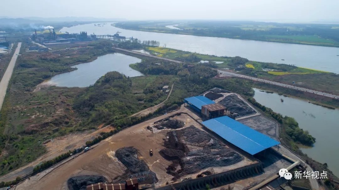 這是3月29日用無人機拍攝的安徽貴池前江工業(yè)園內(nèi)池州恒鑫材料科技有限公司廠區(qū)內(nèi)的長江堤岸旁傾倒的選礦尾渣。新華社記者 郭晨 攝