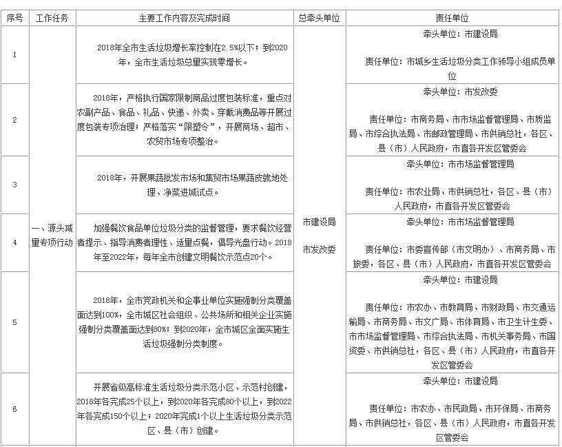 以控增量、促減量、提質(zhì)量為目標,通過實施生活垃圾源頭減量、回收利用、制度創(chuàng)新、處置能力提升、文明風尚等五大專項行動,按照廚余垃圾(易腐垃圾)、有害垃圾、可回收物、其他垃圾的四分法要求,建立匹配完善的生活垃圾分類投放、收集、運輸及處置體系,城鄉(xiāng)生活垃圾“減量化、資源化、無害化處理”達到較高水平,實現(xiàn)生活垃圾治理攻堅戰(zhàn)“一年見成效、三年大變樣、五年全面決勝”:
