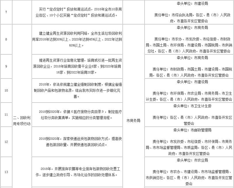 (一)一年細分目標。2018年,全市生活垃圾增長率控制在2.5%以下;市區(qū)城區(qū)、縣(市)城區(qū)和農(nóng)村分類覆蓋面分別達到80%、60%和75%;全市黨政機關(guān)和企事業(yè)單位實施強制分類覆蓋面達到100%,全市城區(qū)社會組織、公共場所和相關(guān)企業(yè)實施強制分類覆蓋面達到80%;新增生活垃圾焚燒穩(wěn)定運行處置能力2250噸/日、餐廚垃圾處置能力500噸/日;新增省級高標準生活垃圾分類示范小區(qū)、示范村各25個;初步建立全市再生資源回收利用網(wǎng)絡(luò),其中培育回收骨干企業(yè)8家;完成城區(qū)范圍內(nèi)不符合規(guī)范要求的生活垃圾清運車輛和中轉(zhuǎn)站整治改造;市、縣兩級初步建立生活垃圾分類處理智能化大數(shù)據(jù)平臺;城鄉(xiāng)生活垃圾分類投放正確率穩(wěn)步提升,回收利用率、資源化利用率、無害化處理率分別達到30%以上、80%以上、100%。
