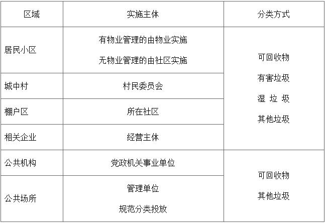 根據(jù)生活垃圾成分構(gòu)成與產(chǎn)生主體的特點(diǎn),實(shí)行“4+2”分類(lèi)方式,即居民小區(qū)、城中村、棚戶(hù)區(qū)、相關(guān)企業(yè)采用四分法,分為可回收物、有害垃圾、濕垃圾、其他垃圾;公共機(jī)構(gòu)、公共場(chǎng)所采用二分法,分為可回收物、其他垃圾。
