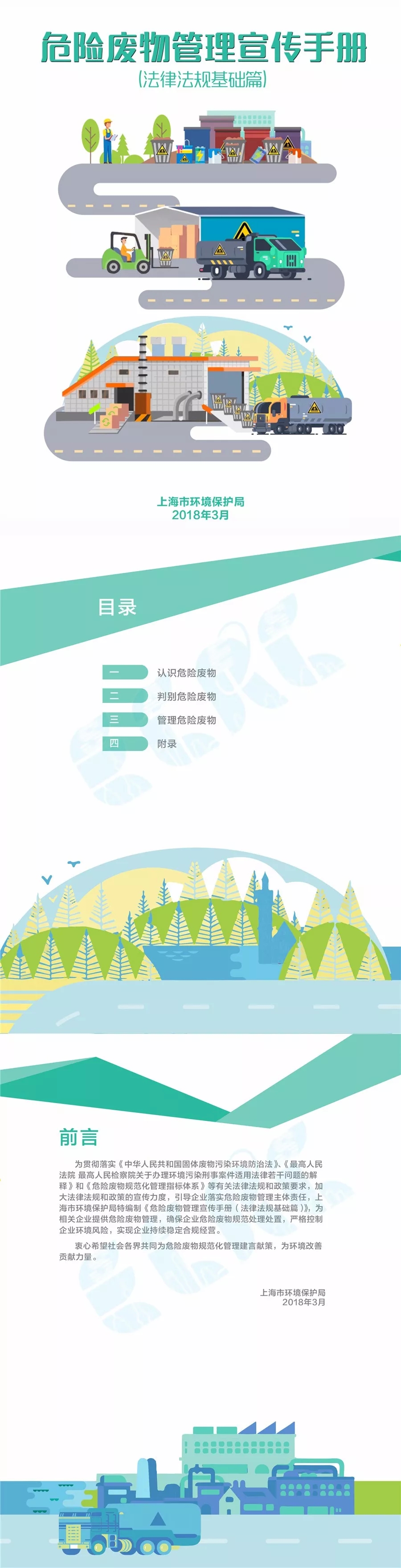 為提升企業(yè)環(huán)境保護意識,規(guī)范危險廢物管理,上海市環(huán)保局組織編制本《 危險廢物管理宣傳手冊 ( 法律法規(guī)篇 ) 》 ,供企業(yè)參考使用。希望廣大企事業(yè)單位主動承擔主體責任,規(guī)范自身行為,合規(guī)守法經(jīng)營。