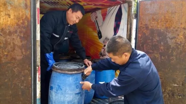 ④ “地溝油”被搬上專用收運(yùn)車,一車裝滿可以放下十幾桶。