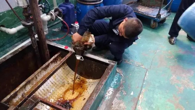 ⑦ 收運(yùn)員將“地溝油”倒入預(yù)處理池,部分雜物被隔離柵擋在外面。圖中用小油桶裝的是餐廳后廚用剩下的“老油”,屬于品質(zhì)相當(dāng)好的廢油脂,收運(yùn)量較少。