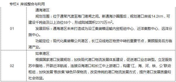 推進岸線整合與利用。提升開發(fā)利用區(qū)岸線使用效率,合理安排港口岸線、過江通道岸線、取排水口岸線??刂葡嚓P企業(yè)無序占用岸線,推進公共碼頭建設。港口工業(yè)生產岸線騰退轉移,生活、生態(tài)岸線空間穩(wěn)步增加,實現(xiàn)“三生”空間有序發(fā)展,統(tǒng)籌重要過江通道岸線的控制預留。加快沿江原南通港區(qū)、任港港區(qū)、狼山港區(qū)、富民港區(qū)以及江海港區(qū)的分期轉移和整合,形成沿江五港區(qū)的總體格局。嚴控新增港口岸線利用,取消或調整與水源保護、生態(tài)紅線區(qū)域等有沖突的港口碼頭。對一些開發(fā)布局不合理、未按國家有關規(guī)定、不符合規(guī)劃的開發(fā)利用項目逐步加以糾正。對涉及岸線利用的各類違法違規(guī)行為,重點清理整頓,逐步消除存量,堅決遏制增量。依法取締不具備安全生產條件、不符合環(huán)境保護要求的非法碼頭和裝卸點,到2020年,沿江非法碼頭徹底消除。建立健全長江岸線保護和開發(fā)利用協(xié)調機制,統(tǒng)籌岸線與后方土地的使用和管理。探索建立岸線資源有償使用制度。